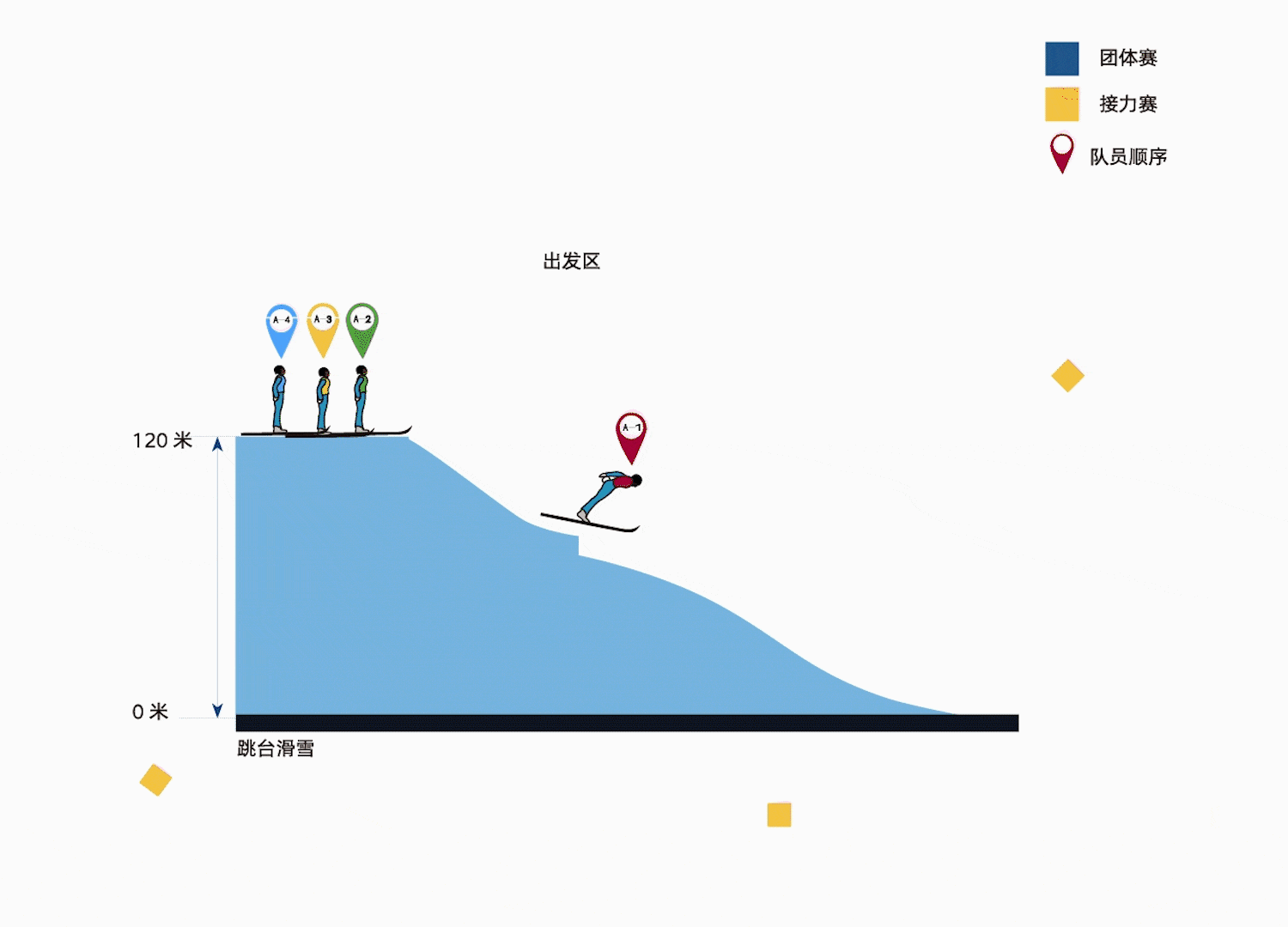 每队有 4 名队员,每位运动员都有两跳的机会,每跳都以“姿势分”和“距离分”相加评分。每队共有 8 个得分,8个得分合并计算得出每队跳台滑雪的最终成绩。跳台滑雪成绩最优的队伍在越野滑雪接力赛中首先出发,其他队伍要根据跳台滑雪的成绩差换算为秒数,作为出发顺序间隔的时长。每个队伍的第 2、第 3、第 4 名运动员相继在接棒区等候,接棒完成后立即出发越野滑行 5 公里,首先到达终点的队伍获胜。