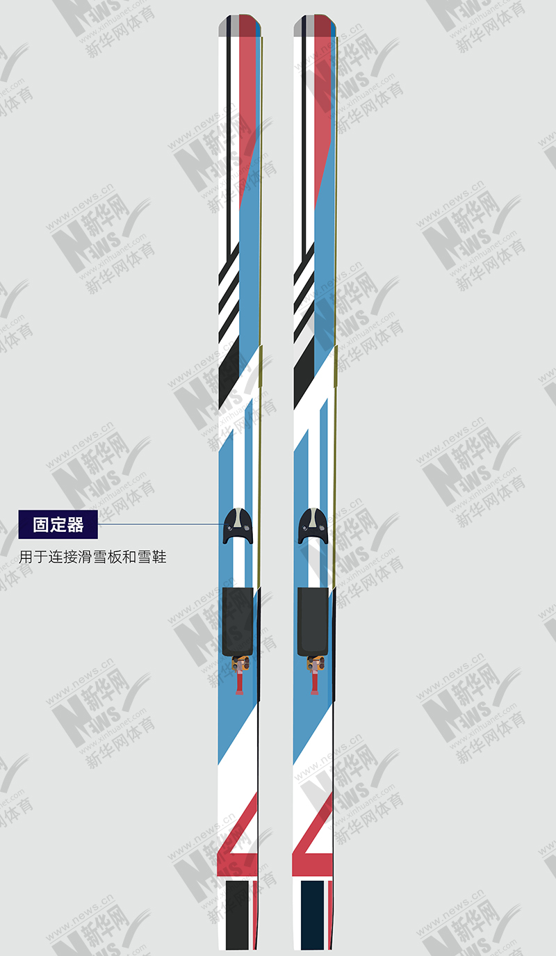 跳台滑雪板长2.3~2.7米,滑雪板越宽越容易在空中获得升力,但最宽不能超过11.5厘米。板底有3~5条方向槽,可以提高运动员空中飞行的效率。