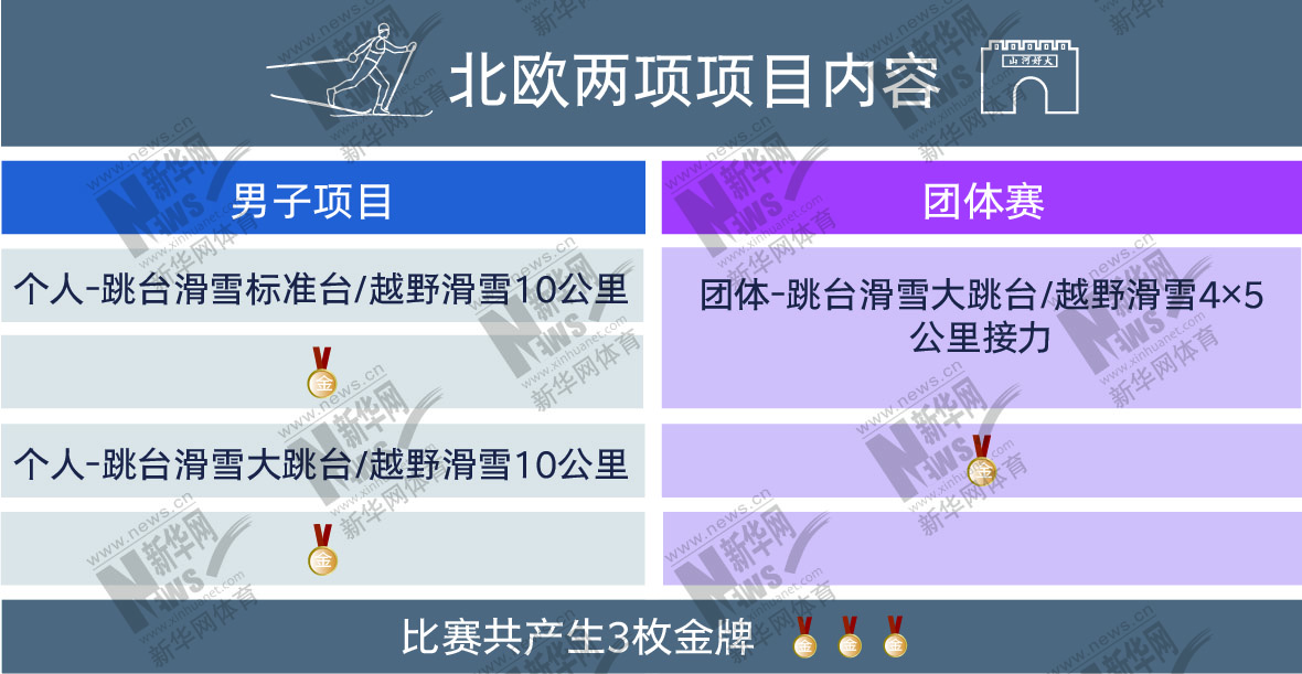 北京 2022 年冬奥会北欧两项比赛将一共产生3枚金牌。竞赛项目包括男子个人-跳台滑雪标准台/越野滑雪10 公里、个人 - 跳台滑雪大跳台 / 越野滑雪 10 公里和团体 - 跳台滑雪大跳台 / 越野滑雪 4×5 公里接力。比赛将在张家口赛区进行。