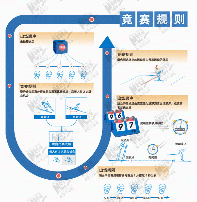 冬奥会跳台滑雪赛的出发顺序为运动员国际雪联积分的倒序,越野滑雪出发顺序则是由跳台滑雪赛的成绩排名决定,得分最高者首先出发。相邻两名运动员的出发间隔时间由他们在跳台滑雪竞赛中的得分差决定,每落后 1 分就要推迟 4 秒出发。