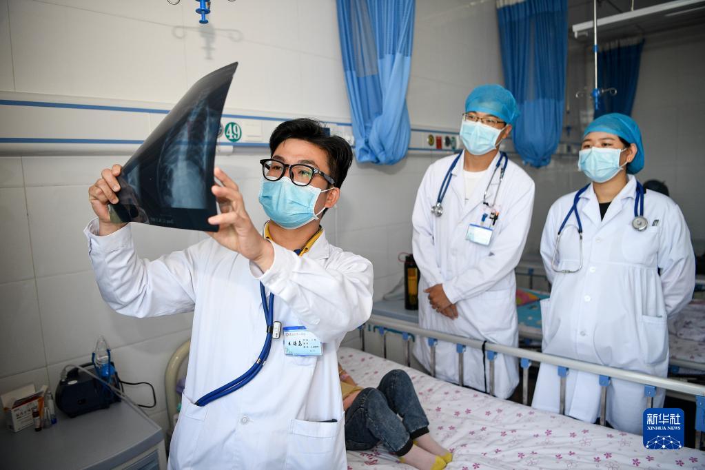 来自福建省泉州市第一医院的医生(左一)与宁夏吴忠市同心县人民医院医生交流患者病情(2020年9月18日摄)。新华社记者 王鹏 摄