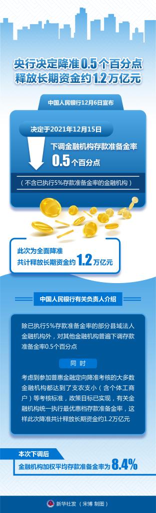 中国人民银行12月6日宣布,决定于2021年12月15日下调金融机构存款准备金率0.5个百分点(不含已执行5%存款准备金率的金融机构)。此次为全面降准,共计释放长期资金约1.2万亿元。新华社发 宋博 制图