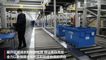 这些防疫物资经过入库验收、自动化存取、零货分拣等仓储流程,正有条不紊地送往一线人员手中。