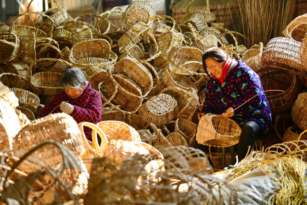 ↑12月28日,安徽省阜阳市阜南县郜台乡刘店村农户在加工编织工艺品。新华社发(吕乃明摄)