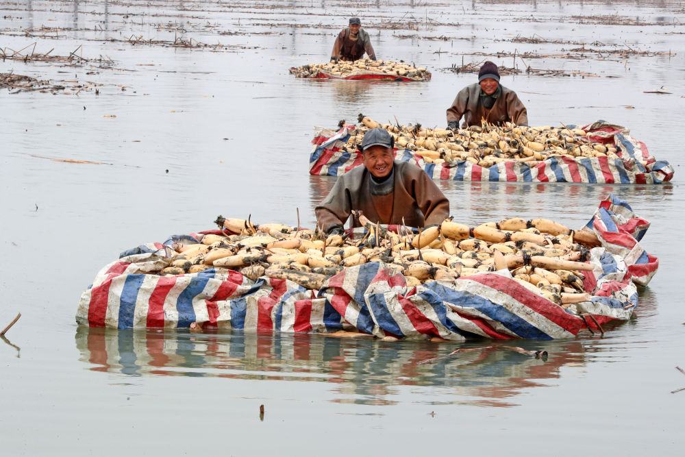 ↑12月28日,在安徽省全椒县十字镇汊河村,藕农将所挖的莲藕运往岸边。