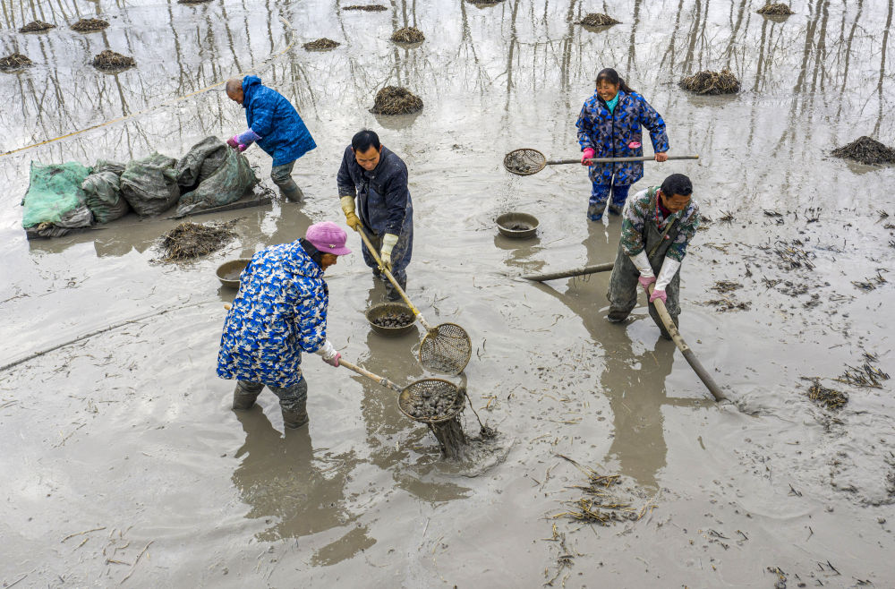 ↑12月28日,安徽省庐江县白湖镇西城村的农民运用高压水枪冲采荸荠。