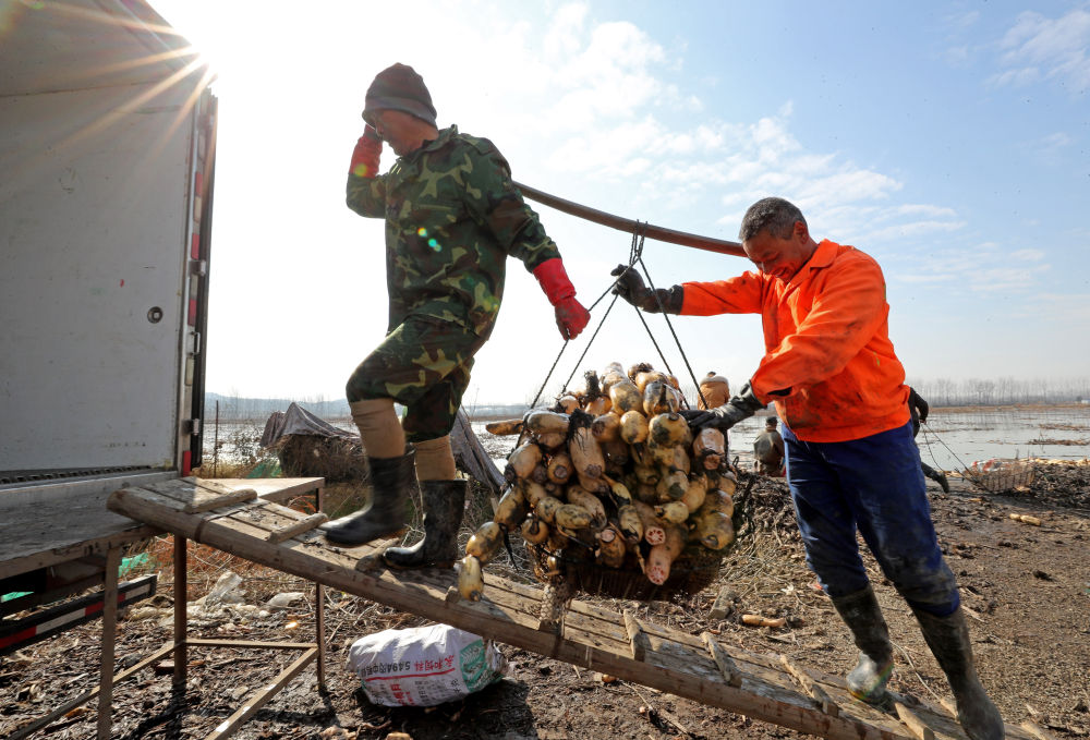 ↑12月28日,在安徽省全椒县十字镇汊河村,藕农在搬运刚刚采收的莲藕。