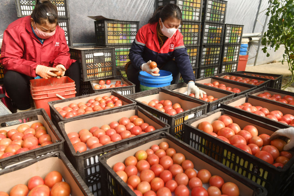 ↑12月28日,在安徽省阜阳市颍东区插花镇板桥村的瓦大番茄谷种植基地,村民在分拣鲜食番茄。新华社发(王彪 摄)