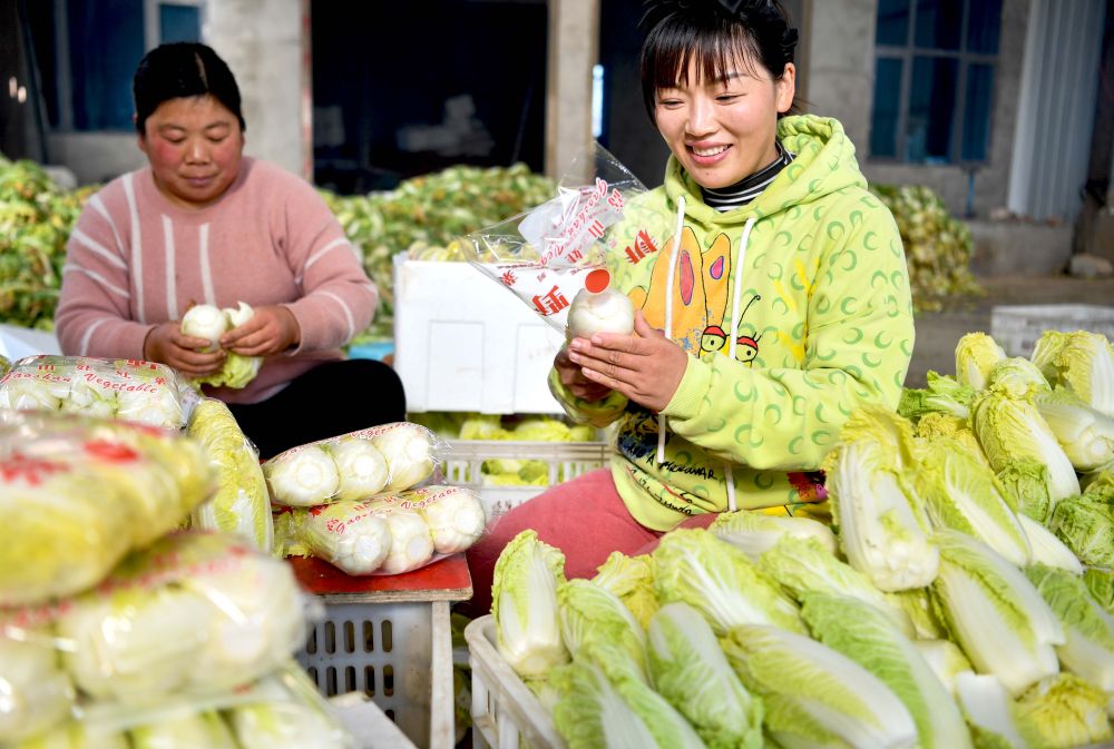 ↑12月28日,在安徽省亳州市谯城区双沟镇吴寨村,菜农在包装娃娃菜供应市场。