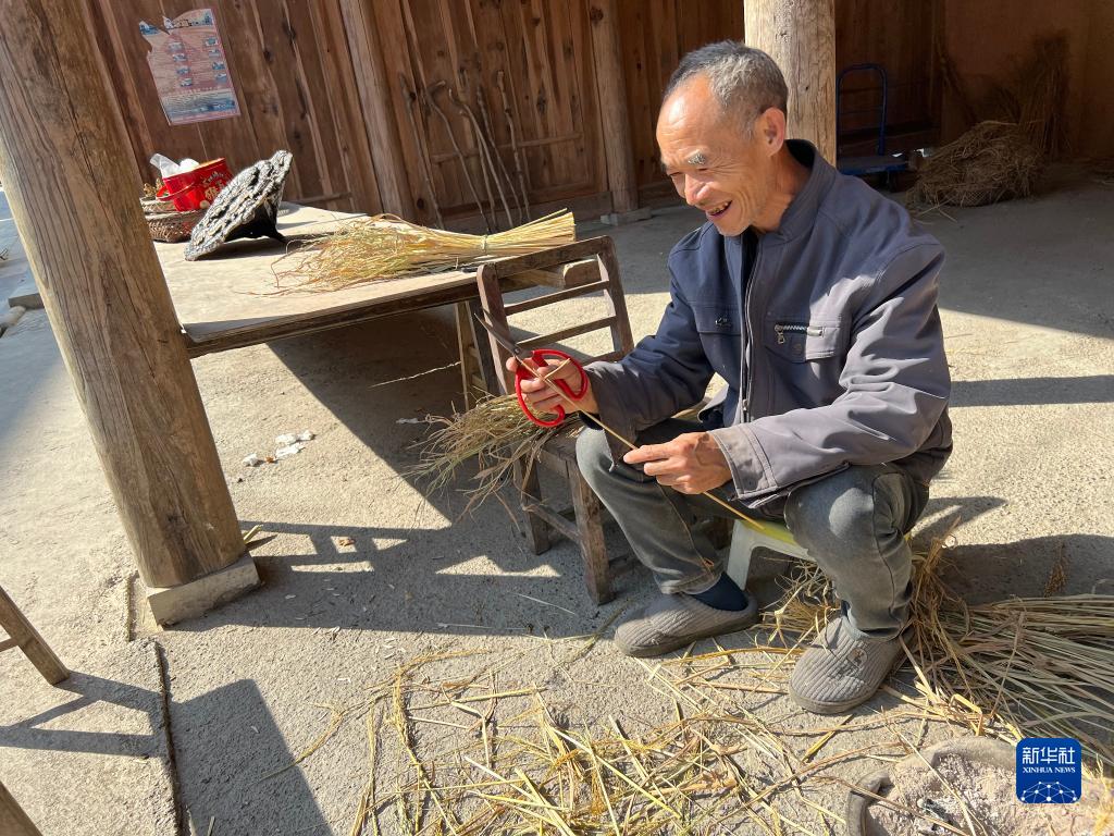 “我在做捆绑黄水粑用的稻谷杆。”坐在自家门前,村民李治林一边忙着劳作,一边笑着向记者打招呼。