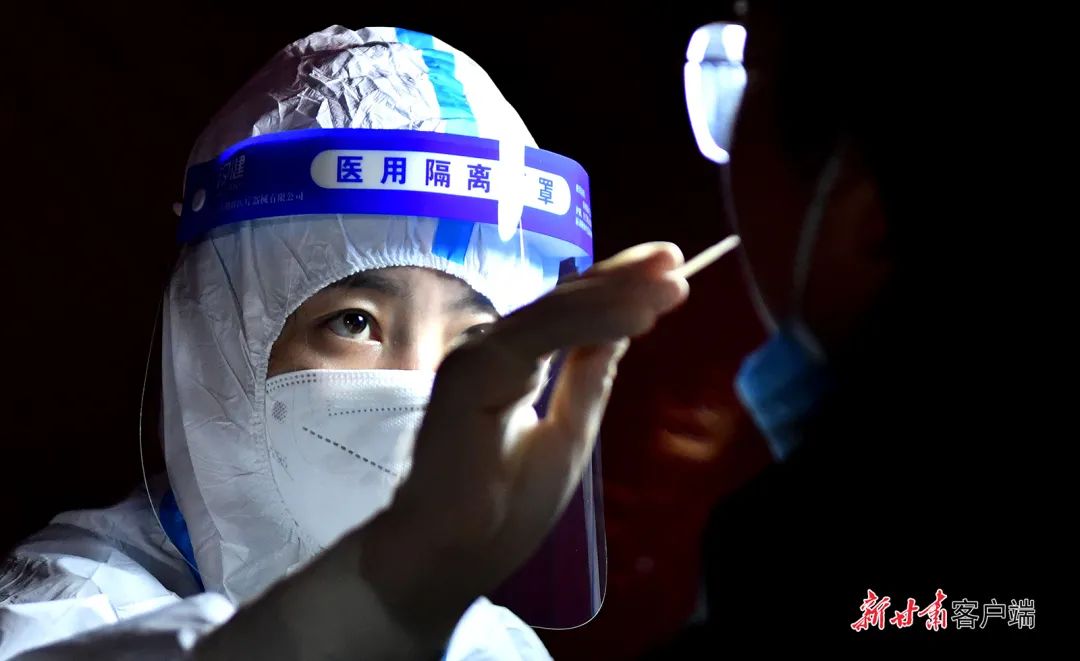 10月31日,天水市秦州区东关街道尚义巷社区的核酸检测采样点上,医护人员夜间为市民进行采样。新甘肃·甘肃日报通讯员周文涛/摄