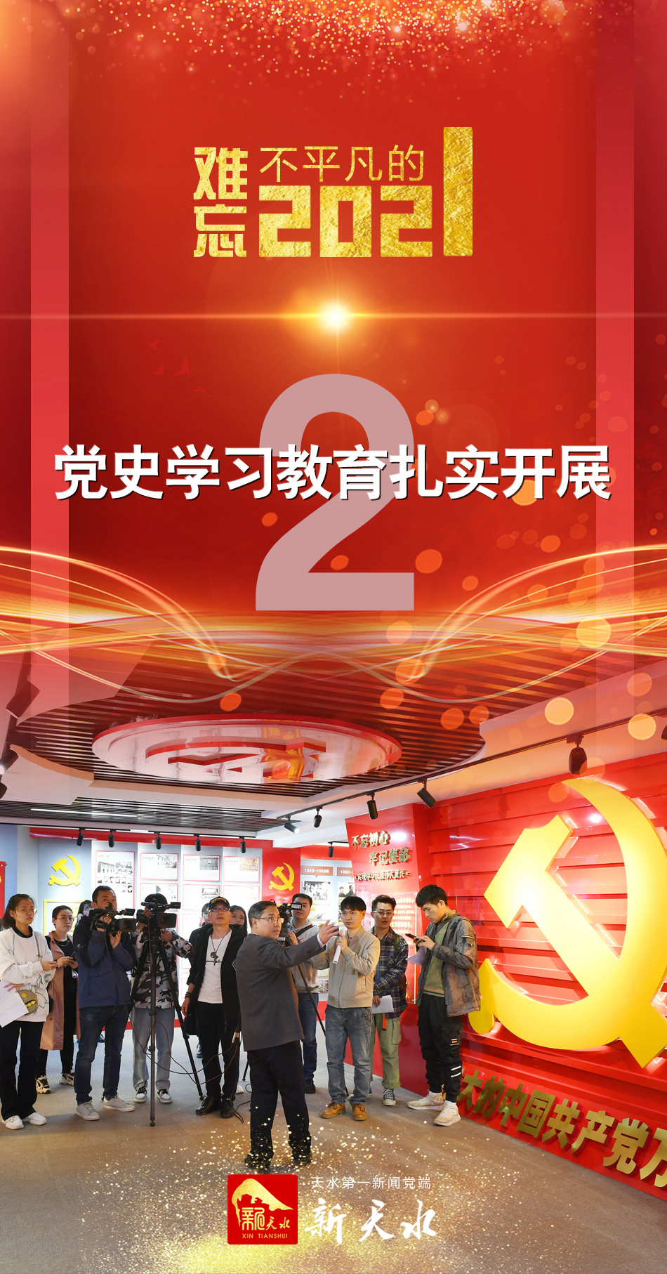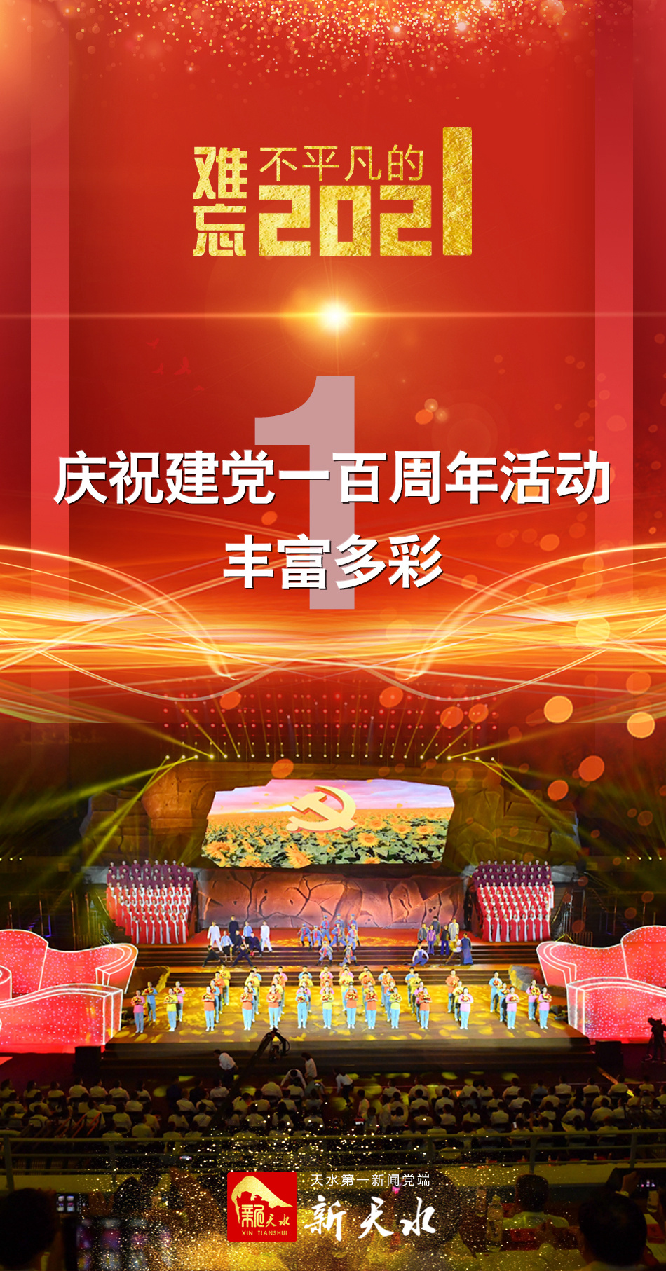 全市深入学习习近平总书记“七一”重要讲话精神;表彰全市优秀党员、优秀党务工作者和先进基层党组织;举办“再唱山歌给党听”天水市庆祝中国共产党成立100周年文艺晚会;颁发“光荣在党50年”纪念章;开展群众性主题宣传教育活动,大力营造重温党的光辉历程、弘扬党的优良传统和团结奋进、开创新局的浓郁社会氛围;积极做好“奋斗百年路 启航新征程”重大主题宣传报道,组织全市各级新闻媒体开设“学党史、悟思想、办实事、开新局”“天水百年红色记忆”“伟大的足迹”“党史相册”“小康圆梦看天水”等专题专栏,刊发庆祝中国共产党成立100周年主题新闻稿件1.8万多条(次)。