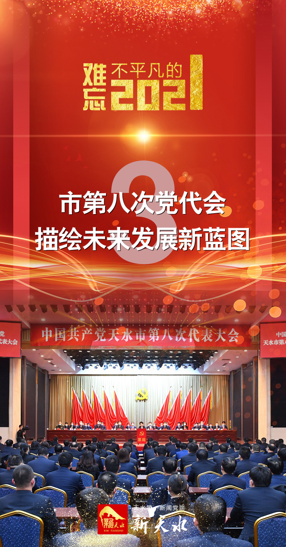 12月10日至12日,市第八次党代会召开,大会确定了未来五年天水发展的指导思想、奋斗目标和主要任务,指出了今后五年的努力方向是:建强省域副中心城市,推动老工业基地走出高质量发展新路子。今后五年的总体要求是:以习近平新时代中国特色社会主义思想为指导,深入学习贯彻党的十九大和十九届二中、三中、四中、五中、六中全会精神,认真贯彻落实习近平总书记对甘肃重要讲话和指示精神,统筹推进“五位一体”总体布局,协调推进“四个全面”战略布局,紧扣“三新一高”要求,更加注重工业强市、产业兴市,更加注重民生改善、共同富裕,更加注重社会治理、风险防控,更加注重党要管党、全面从严治党,着力打造伏羲始祖文化传承创新区、集成电路封测产业聚集区、先进制造业转型升级示范区、果菜畜药高品质现代化特色农业先行区、文旅农康融合发展试验区,奋力建设经济发展、山川秀美、民族团结、社会和谐的幸福美好新天水。