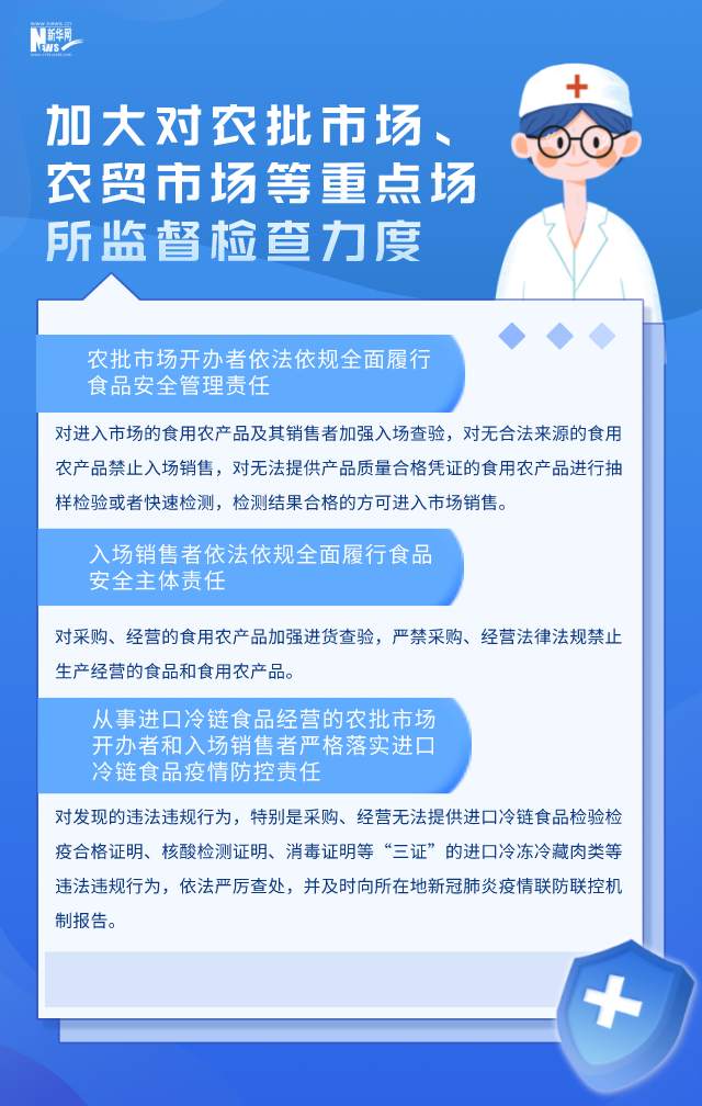党倩英介绍,截至三季度末,各地市场监管部门已检查农贸市场各类食用农产品经营主体215.29万家次,发现违法违规经营主体3.32万家,对发现的违法违规行为均已依法依规严肃查处。下一步,市场监管部门将持续加大对农批市场、农贸市场等重点场所监督检查力度,督促市场开办者和场内经营者严格落实食品安全查验等各项防控责任,并积极配合卫生健康等部门做好农贸市场疫情防控相关工作,切实防范食品安全风险和疫情传播风险。(记者:王莹 根据国务院联防联控机制新闻发布会内容梳理)