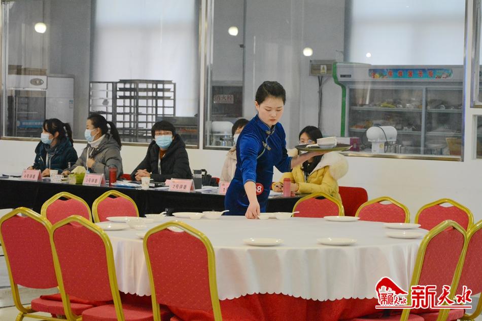 而在甘肃省工业职业技术学院内,酒店服务专业技能大赛也在如火如荼进行中,只见两名参赛选手身着职业服装,在18分钟内完成了摆台、口布折花、斟酒等环节,随后几位评委逐步测量餐具摆放距离、核对座椅角度、查看红酒白酒斟酒高度等。