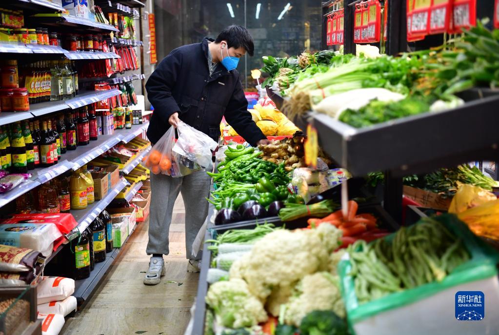 1月7日,西安曲江新区一小区超市内,一名居民在选购菜品。新华社记者 邵瑞 摄