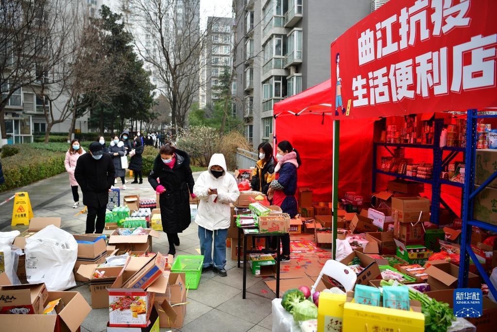 1月7日,居民在西安曲江新区一小区内的生活便利店前排队购买食品。新华社记者 邵瑞 摄
