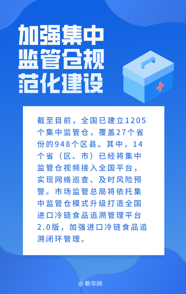 截至目前,全国已建立1205个集中监管仓,覆盖27个省份的948个区县。其中,14个省(区、市)已经将集中监管仓视频接入全国平台,实现网络巡查、及时风险预警。市场监管总局将依托集中监管仓模式升级打造全国进口冷链食品追溯管理平台2.0版,加强进口冷链食品追溯闭环管理。