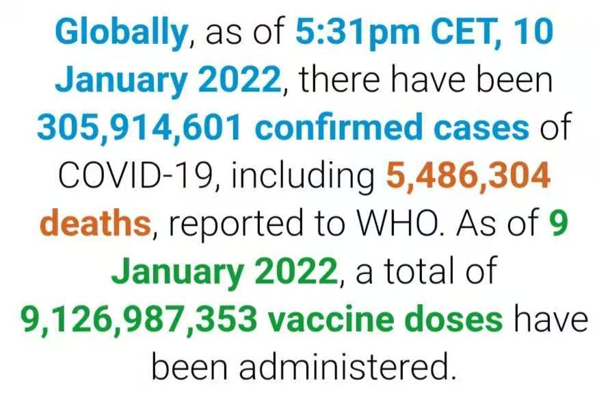 根据世卫组织最新实时统计数据,截至欧洲中部时间1月10日17时31分(北京时间1月11日0时31分),全球累计新冠肺炎确诊病例305914601例,累计死亡病例5486304例。(总台记者 朱赫)