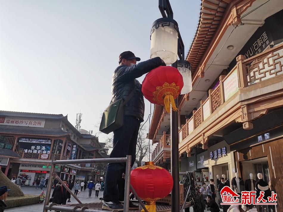 记者在现场看到,工人们有的将灯笼固定在路灯架子上,有的忙着布线,现场紧张有序、忙而不乱。