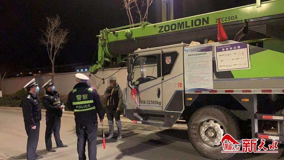 新天水讯 1月10日晚,秦安县公安局交警大队民警依法查处一起无证驾驶吊车的道路交通违法行为。