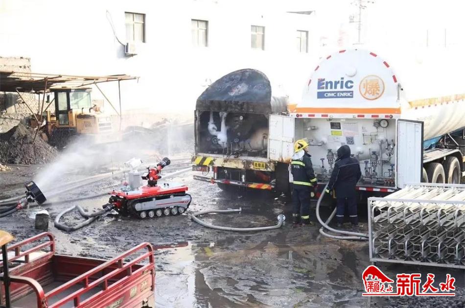 新天水讯【记者蔚军平】1月10日,经过12个小时的紧张扑救和排压放空罐车残余液体,天水市消防救援支队成功排除了一起液化天然气罐车泄露起火险情,灭火机器人在火场核心区域实施冷却降温,派上了大用场。