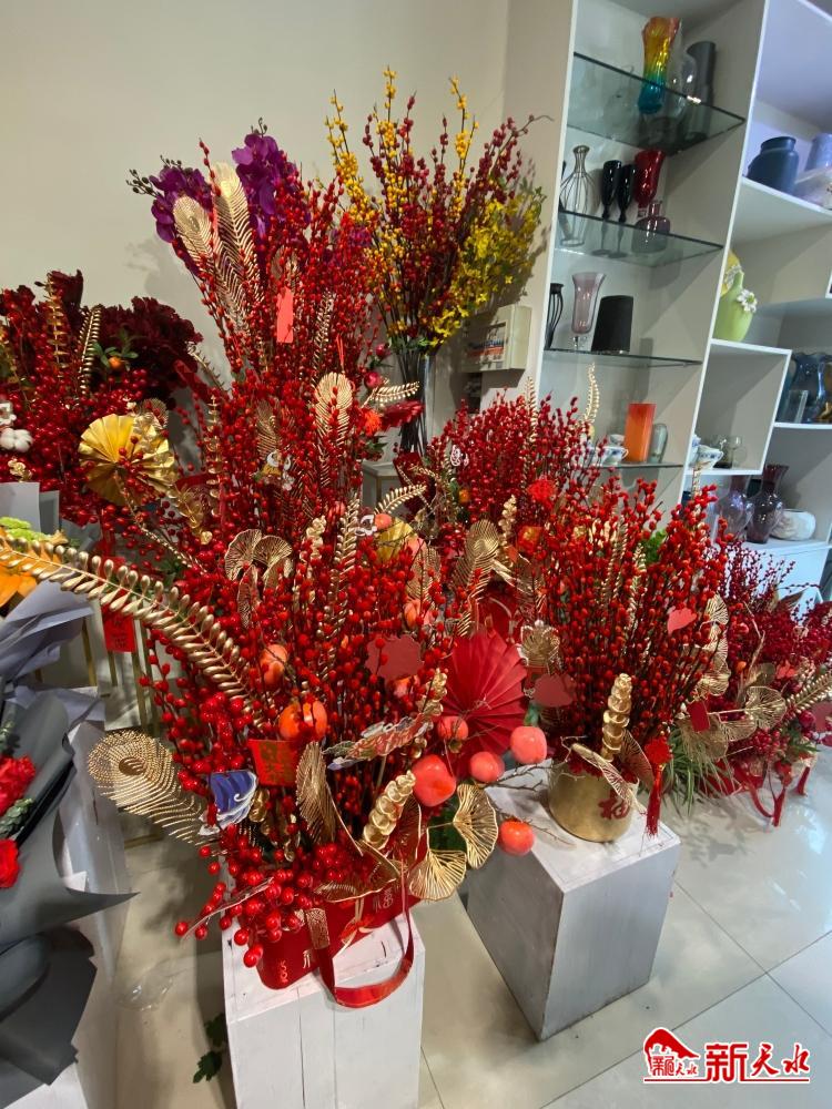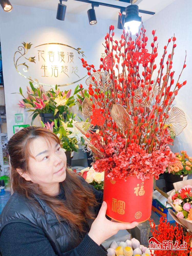 1月13日,在位于秦州区民主东路的一家花店里,记者一走进大门,便被大大小小一片红色喜庆颜色包裹着的年宵花吸引了眼球。店员热情地招呼着记者说:“新年讲究‘红’运当头,红红火火的暖色系自然是年宵花的热门款,这些福桶年宵花主要是红色银柳,配上金色的新年装饰,按照花株多寡,价格在238元至288元之间,深受消费者青睐。”