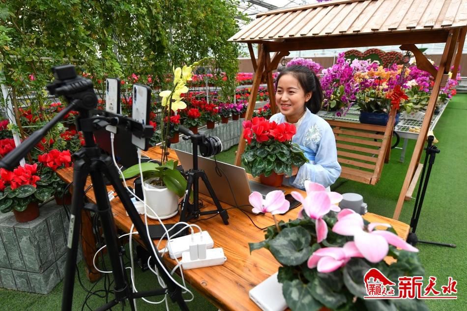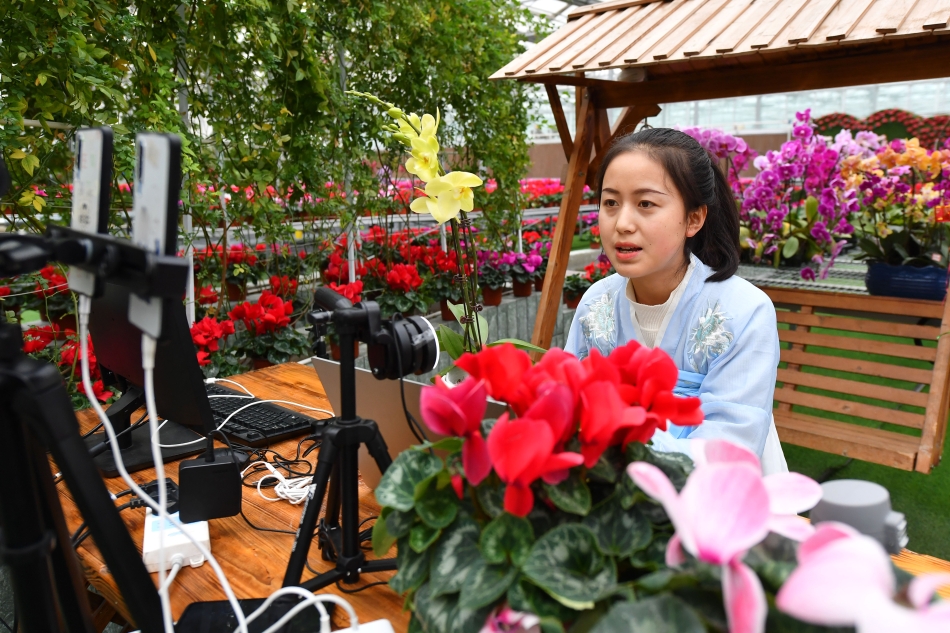 1月17日,清水县花卉园区内主播正在利用网络直播销售花卉。今年以来,在直播已经成为电商销售主流模式的当下,清水县花卉园也开始借助网络的力量,以自己丰富的经验传授花卉产品知识和养护技术,吸引顾客,进一步拓宽销路。