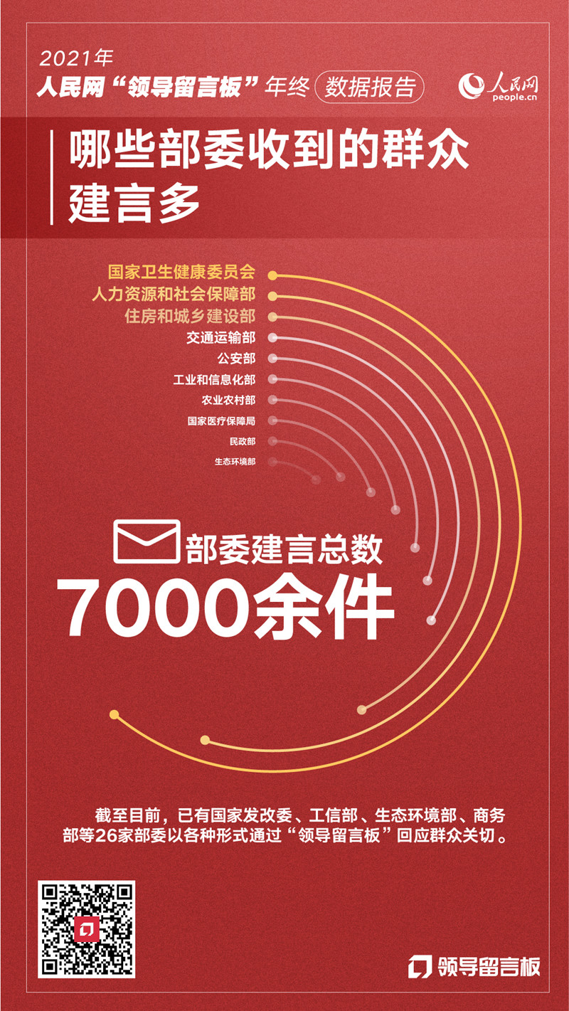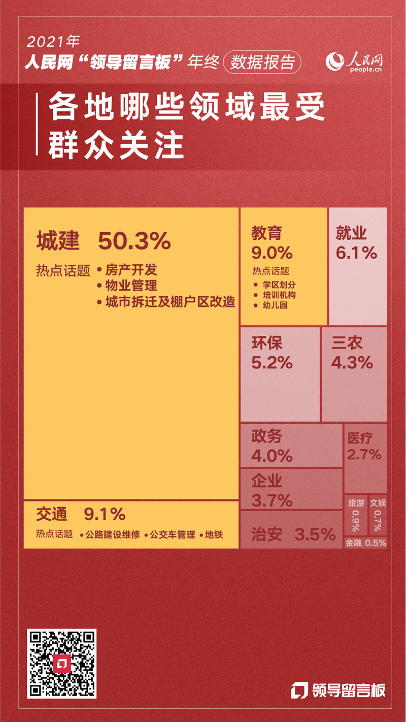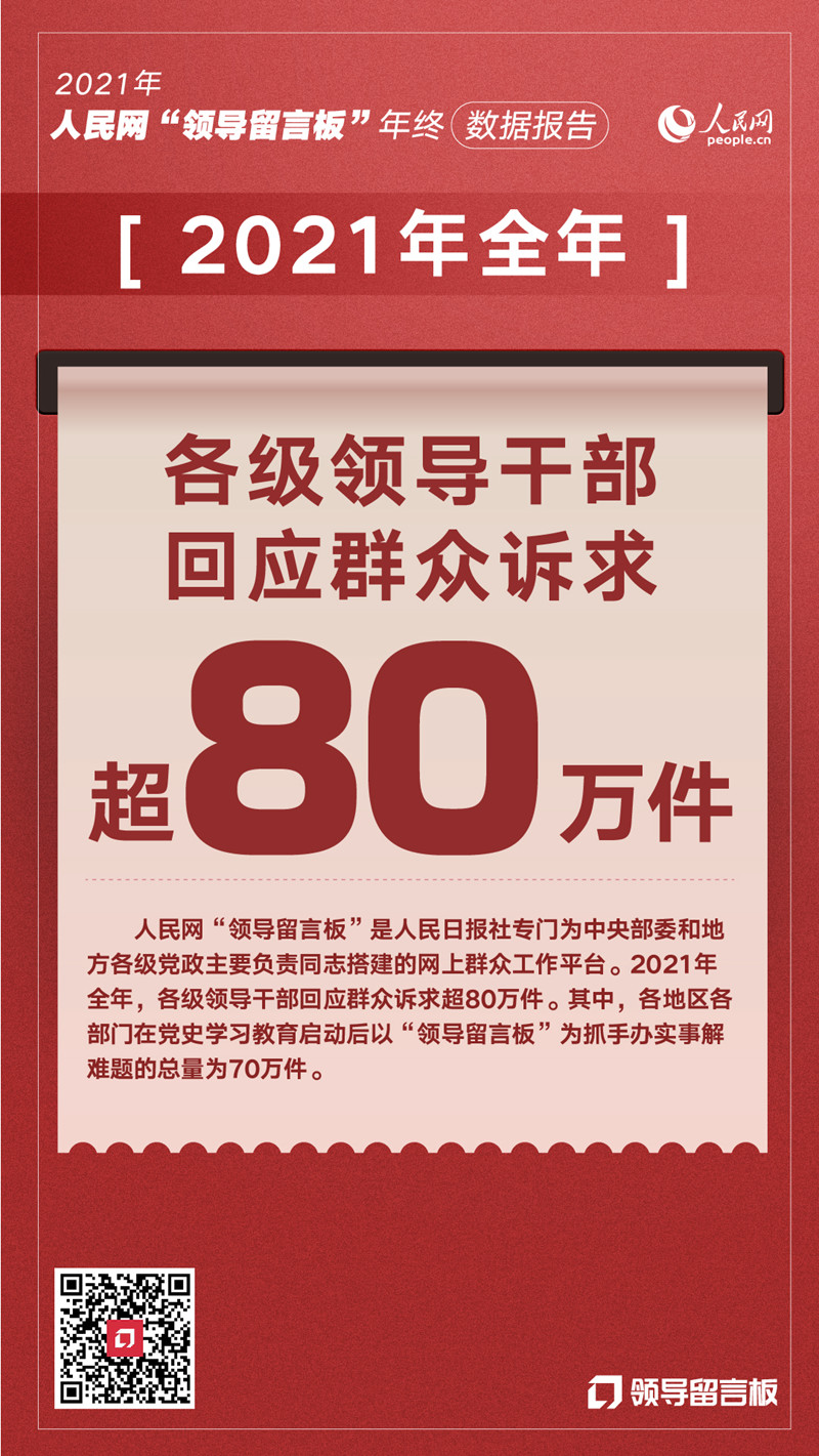 2021年全年,各级党政领导干部通过人民网“领导留言板”回应群众诉求和意见建议超80万件;各地入驻的留言办理职能单位新增近2000家;城建、教育、交通成为全年各地群众留言关注度较高的领域;各地群众对留言办理工作给出的评价中,“效率高”“圆满解决”“感谢”“暖心”成为高频词。随着党史学习教育开展并不断深入推进,各级领导干部主动将网上群众工作平台视为开展“我为群众办实事”实践活动的重要抓手,精准聚焦群众反映集中的急难愁盼,实打实解决了一大批民生问题、推动了一大批民生领域改革、实施了一大批民生工程,人民群众获得感、幸福感、安全感不断增强。(编辑:曾帆 孙梅;制图:毛然)