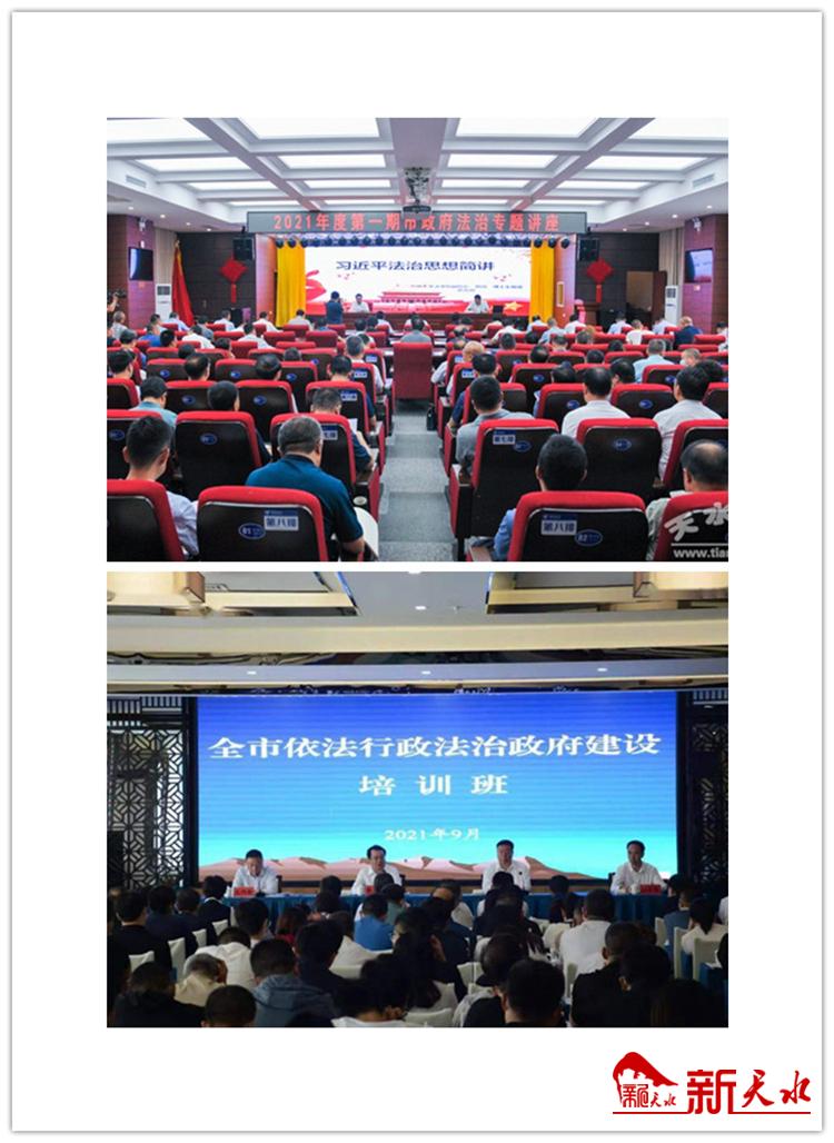 2021年,天水市全面贯彻落实习近平法治思想,将“科学立法、严格执法、公正司法、全民守法”依法治国十六字方针,贯彻落实到社会各领域、各层面,市委常委会研究部署依法治市、“八五”普法、依法行政工作,市人大常委会审议通过“八五”普法规划,市委依法治市委召开依法治市工作会议、3次委员会会议,市委依法治市办召开办公室主任会议,研究部署法治天水建设工作,秉承“法治天水全民共建 法治成果人人共享”的理念,坚持把体现人民利益、反映人民愿望、维护人民权益、增进人民福祉落实到全面依法治市全过程,推动了法治天水建设高质量发展。