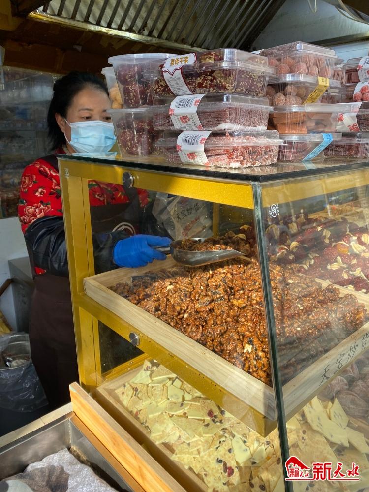 “这是我们店新推出的炒酸奶、琥珀核桃仁、核桃红枣等新的干果口味,都是按斤称,价格各不一样,有一斤40元的、50元的、60元的。”1月18日,在秦州区青年北路的一家干果店门口,玻璃柜台整齐摆放着新品干果,记者看到,不时有顾客上前称斤买走。