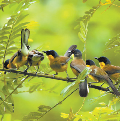 一群蓝冠噪鹛在江西省婺源县月亮湾蓝冠噪鹛自然保护小区栖息。