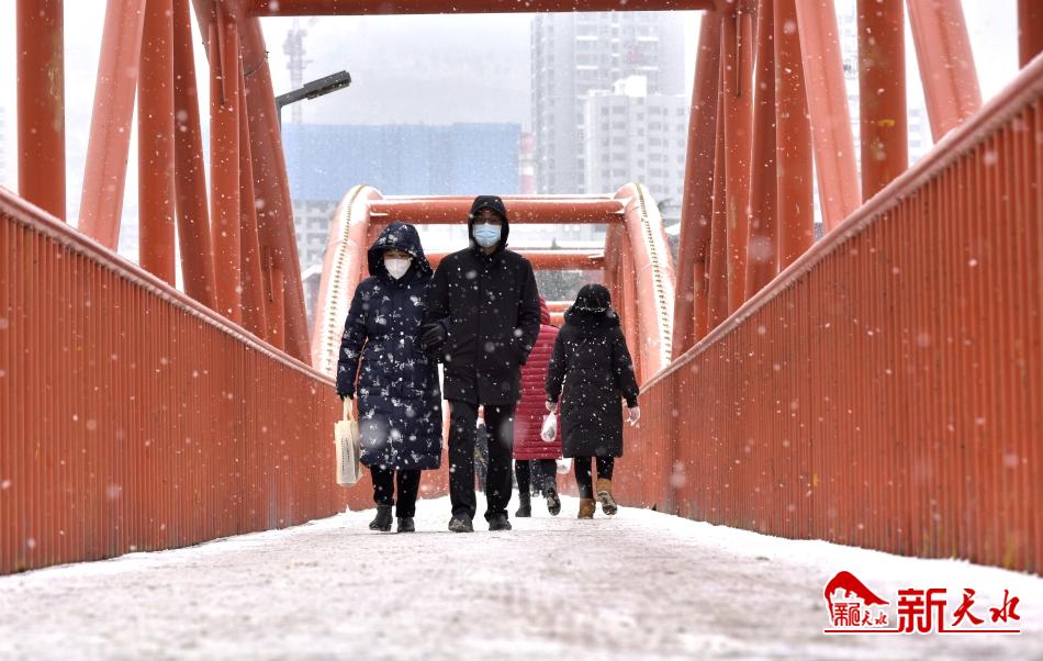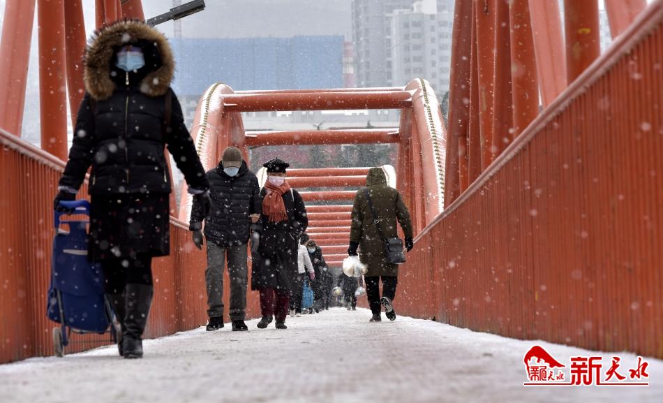 1月23日晨,市民冒雪行走在路上。22日下午至23日,我市普降小雪,冬日里被冰雪覆盖的青山绿水,如同披着轻纱,美不胜收。