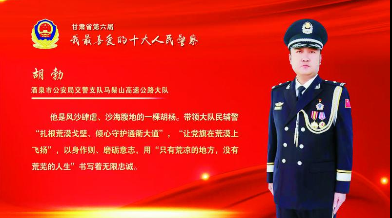 新天水讯 1月25日,甘肃省第六届“我最喜爱的十大人民警察”评选结果正式揭晓,酒泉市公安局交警支队马鬃山高速公路大队大队长胡勃等10名民警当选甘肃省第六届“我最喜爱的十大人民警察”,陇南市礼县公安局指挥中心主任张书秀等20名民警获提名。