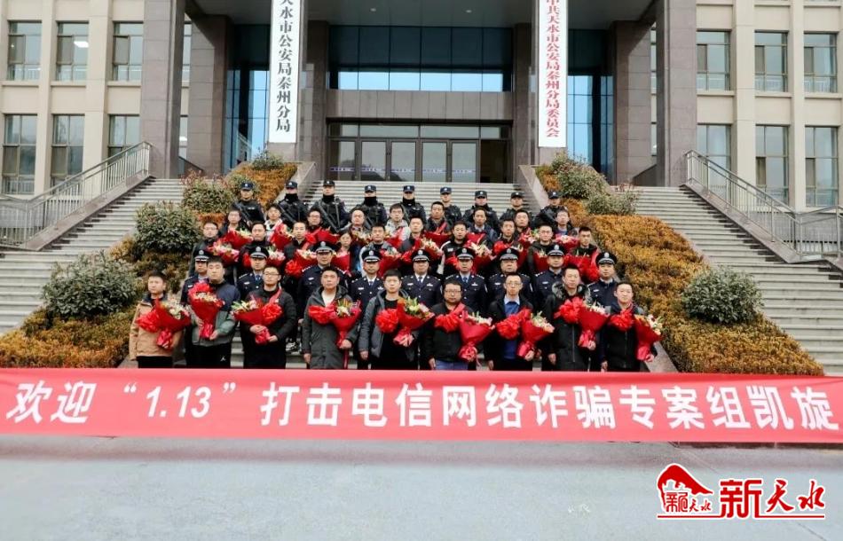 新天水讯【记者蔚军平】1月25日下午,秦州公安分局举行仪式,欢迎“1·13”打击电信网络诈骗专案组凯旋。市公安局、秦州公安分局有关领导向凯旋归来的专案组民警送上鲜花,对专案组民警表示热烈欢迎、致以诚挚祝贺,向参与研判、抓捕、押解的全体人员表示崇高敬意、致以亲切慰问。