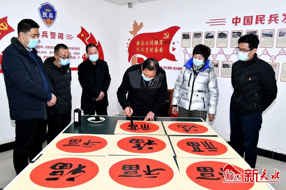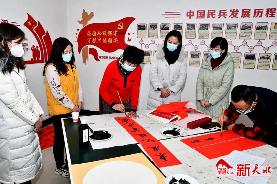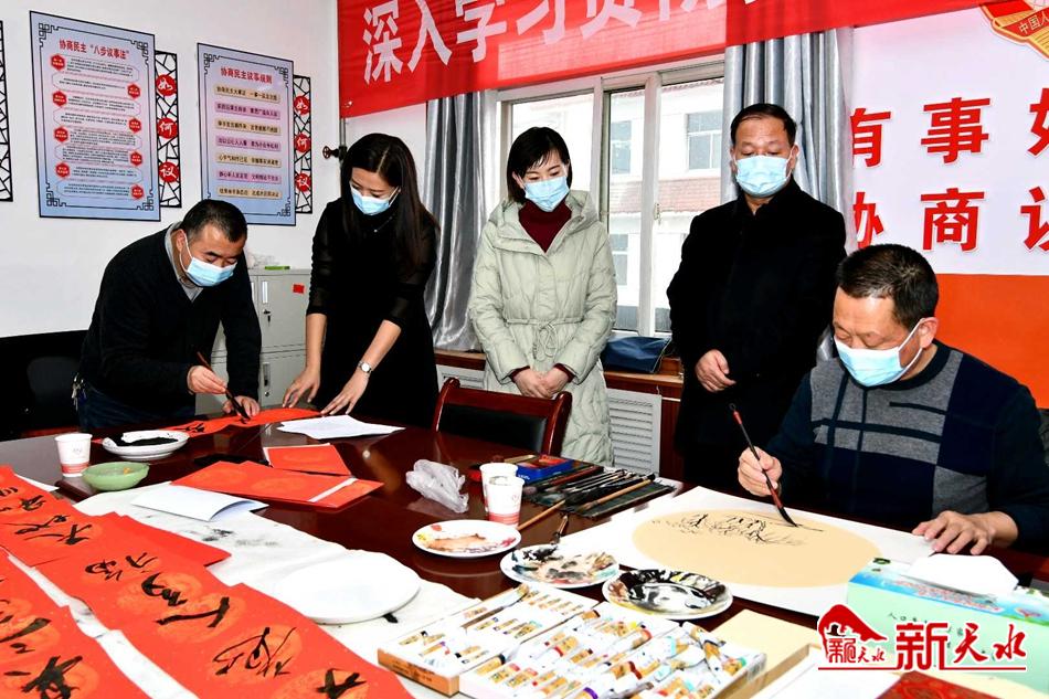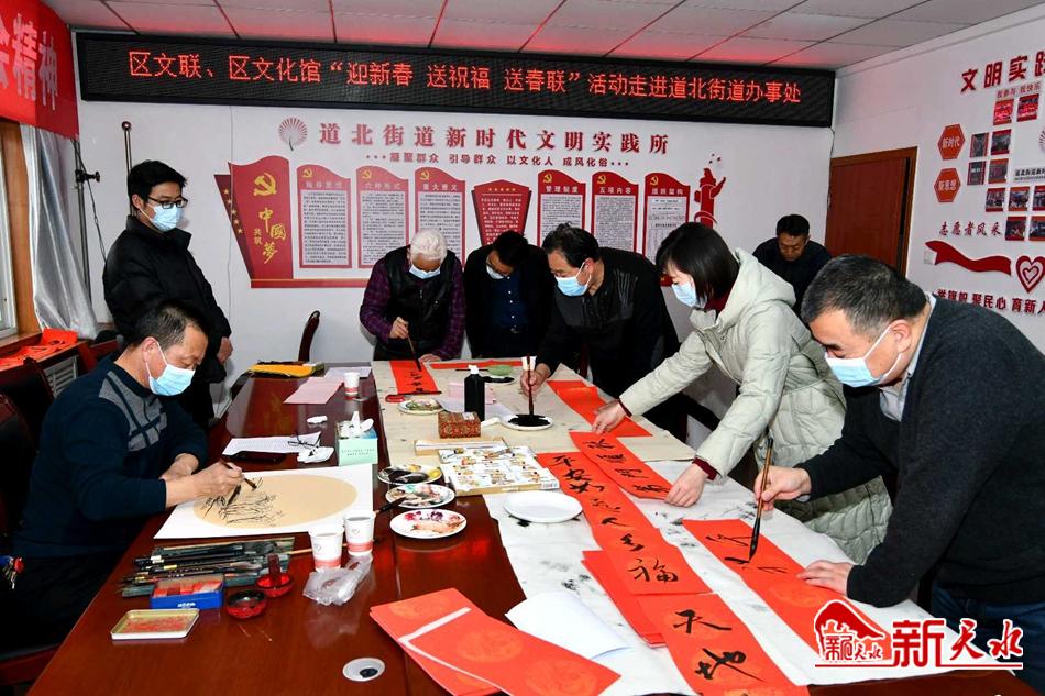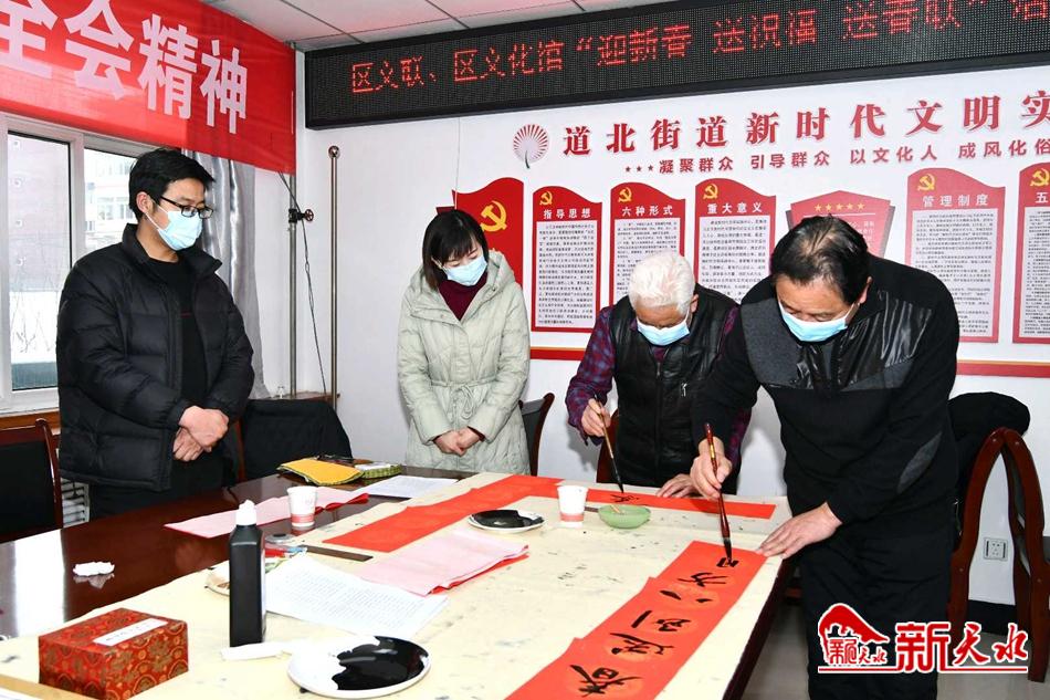新天水讯【特约通讯员窦耀辉】翰墨歌盛世,丹青写华章。1月27日,麦积区文联、区文化馆“迎新春 写春联 送祝福”活动走进道北街道办事处,以特有的方式弘扬中华民族传统文化,丰富干部群众精神文化生活,营造祥和欢乐的节日氛围,为干部职工和城乡居民送去了新年的美好祝福。