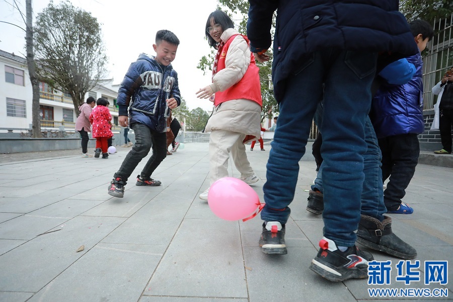 在江西省抚州市乐安县流坑村,大学生志愿者正在陪放寒假的留守儿童玩游戏。新华网发 周智斌 摄