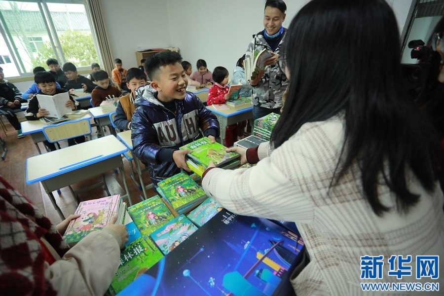 在江西省抚州市乐安县流坑村“童心港湾”活动室内,留守儿童们领取书籍。新华网发 邱志超 摄