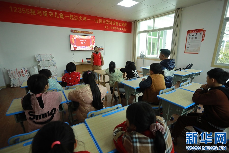 在江西省抚州市乐安县流坑村“童心港湾”活动室内,大学生志愿者正在为留守儿童们讲授春节期间的安全知识。新华网发 邱志超 摄