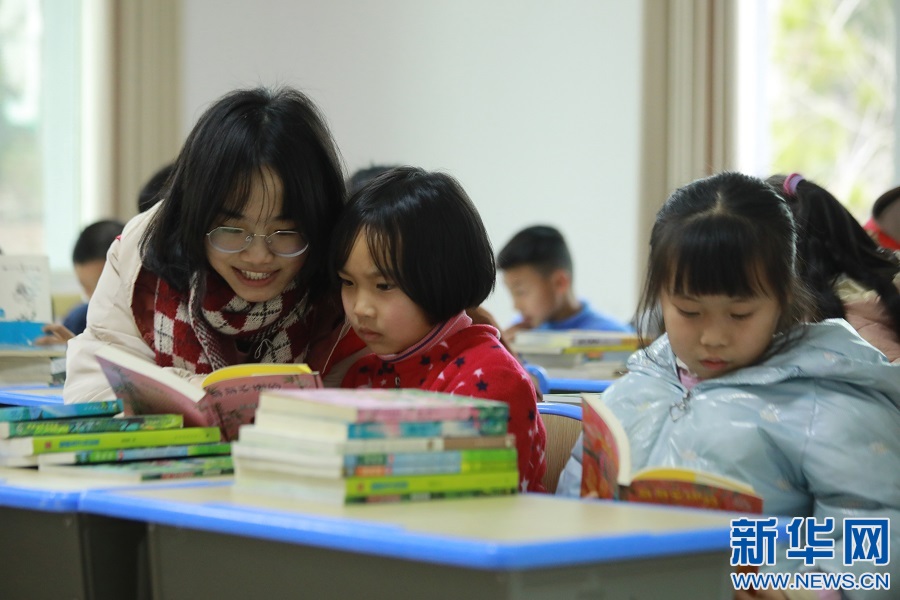 在江西省抚州市乐安县流坑村“童心港湾”活动室内,大学生志愿者正在陪放寒假的留守儿童看书。新华网发 周智斌 摄
