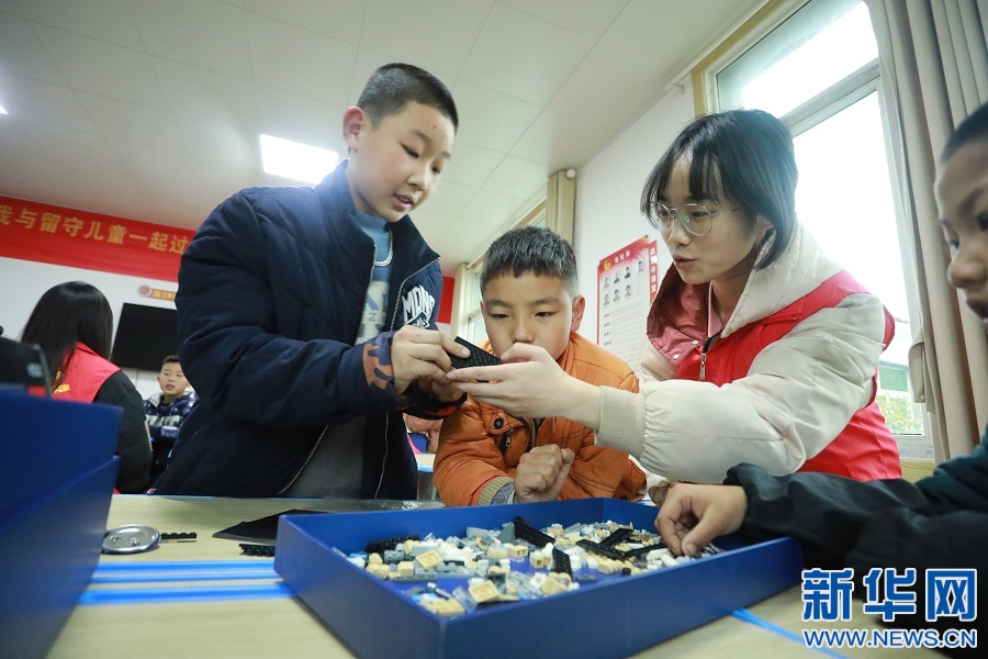 在江西省抚州市乐安县流坑村“童心港湾”活动室内,大学生志愿者正在陪放寒假的留守儿童搭积木。新华网发 邱志超 摄