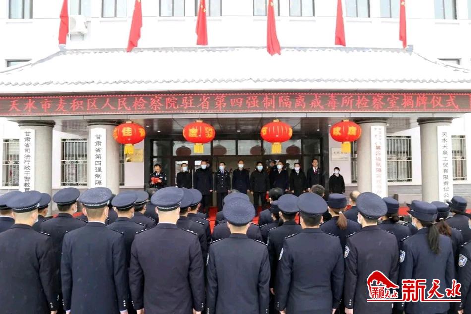 新天水讯 1月27日,天水市麦积区人民检察院“驻甘肃省第四强制隔离戒毒所检察室”正式挂牌成立,从而成为全省检察机关首家挂牌成立的驻戒毒监管场所检察室。麦积区委书记康泰来和市检察院副检察长王全社共同为“驻所检察室”进行了揭牌,标志着麦积区检察院开展驻戒毒监管场所行政检察监督工作迈出了第一步。