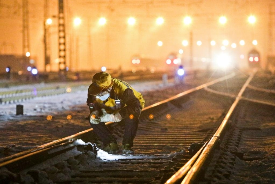 2022年1月22日,中国铁路郑州局集团有限公司南阳工务段南阳西线路车间的职工对清理后的道岔进行检测验证。新华社发(张中海 摄)