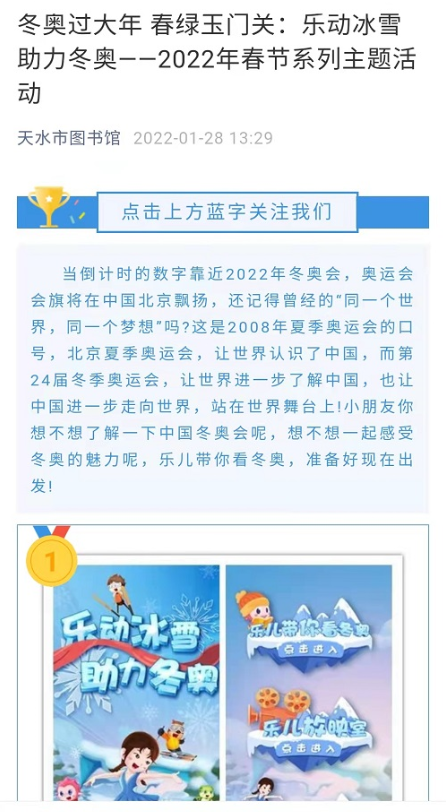 天水市图书馆利用寒假开展乐动冰雪 助力冬奥——2022年春节系列主题活动,让青少年在参与研学活动的同时学习冬奥知识,感受冬奥氛围,共同迎接第24届冬奥会和虎年新春的到来。读者只需手机扫描二维码进入“乐儿微信图书馆”,从了解第一届希腊奥运会和现代奥运会的起源开始,到了解北京冬奥会的场馆设置,中国冬奥的“黑科技”等,这些场馆可是“黑科技”满满,采用科学绿色环保建造技术,水立方秒变冰立方,京张铁路的开通连接了三大赛区,这些都充分体现了中国的实力及中国对世界的诚意!