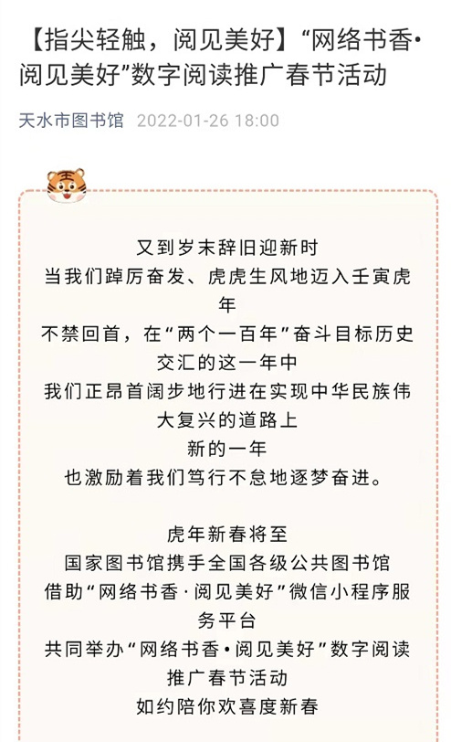 1月25日,天水市图书馆借助“网络书香·阅见美好”微信小程序服务平台,举办“网络书香·阅见美好”数字阅读推广春节活动,读者只需手机“扫一扫”小程序,即可畅享更加丰富的阅读资源。精品文学、青少资源、榜样精神等主题的优质资源将陪你一起,过个不一样的书香年。活动期间,读者不仅可以定制专属海报,作为年礼互赠亲友;还可以通过线上打卡阅读参与签到、点赞、分享等互动活动,点亮新一年的阅读时光,还有机会获得活动勋章及积分好礼。