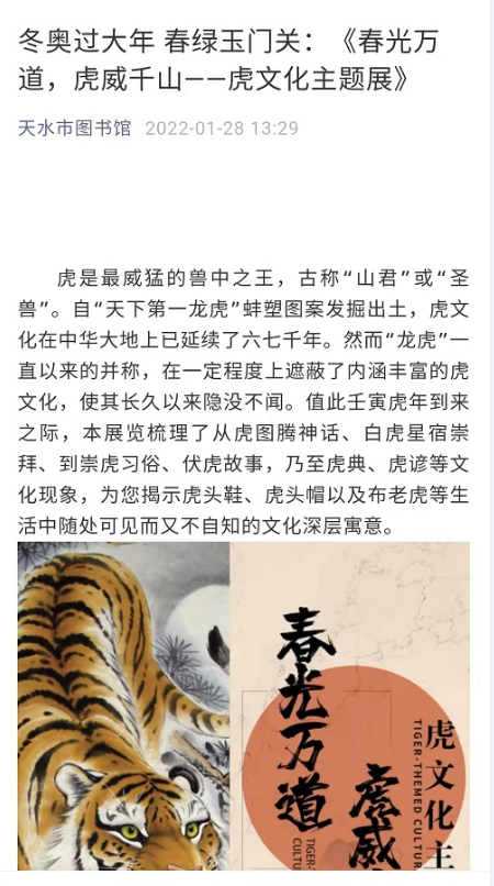 壬寅虎年到来之际,天水市图书馆特别举办“春光万道 虎威千山——虎文化主题展”,展览从1月28日起在天水市图书馆微信平台开展。作为对虎年新春的贺礼,展览梳理了从虎的起源与分布、虎图腾神话,到白虎星宿崇拜、崇虎习俗,乃至虎工艺等文化现象,并为您揭示虎头鞋、虎头帽、布老虎等生活中随处可见的手工艺品背后的深层文化寓意,并预祝您虎年虎虎生威!
