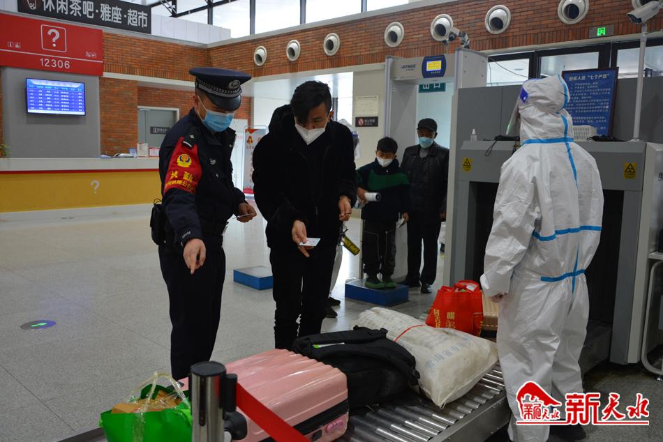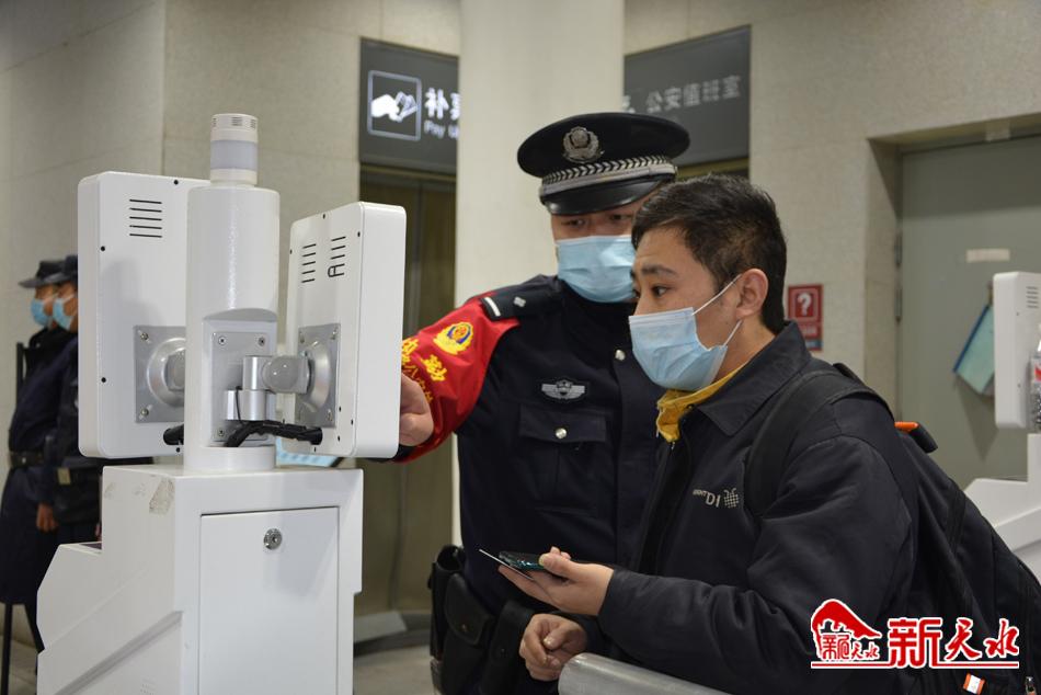 在进站口,身穿警服的铁路民警协助站务人员查看旅客绿码、行程码,沿途有民警在站岗执勤;安检处,民警配合对旅客的行李进行查验;候车厅,也有巡逻民警的身影。