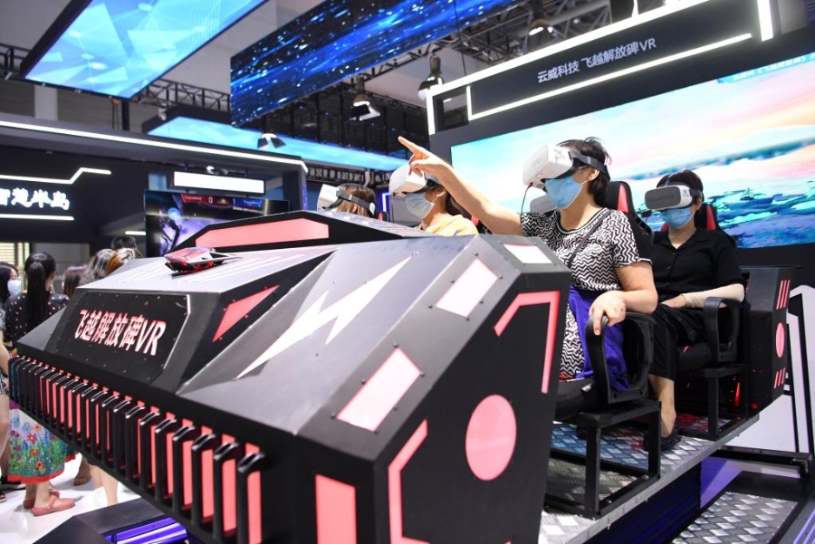观众在2021智博会上通过VR技术体验重庆美景。新华社记者 唐奕 摄