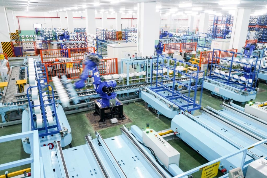 位于江苏省苏州市吴江区盛泽镇的一家智能车间,机器人在车间内自动作业。新华社记者 李博 摄