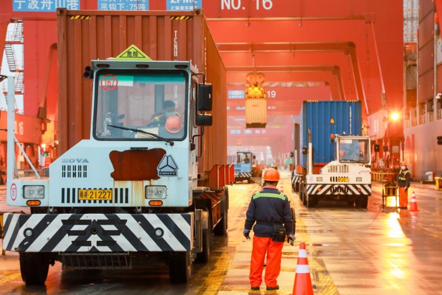 浙江宁波舟山港梅山港区桥吊在紧张作业。新华社发(杨江琦 摄)